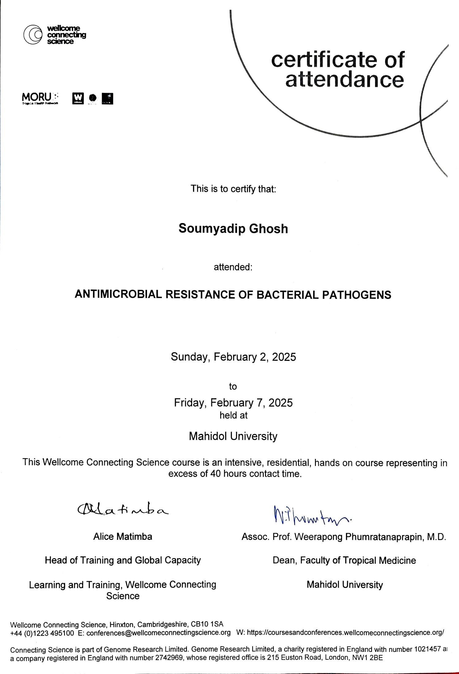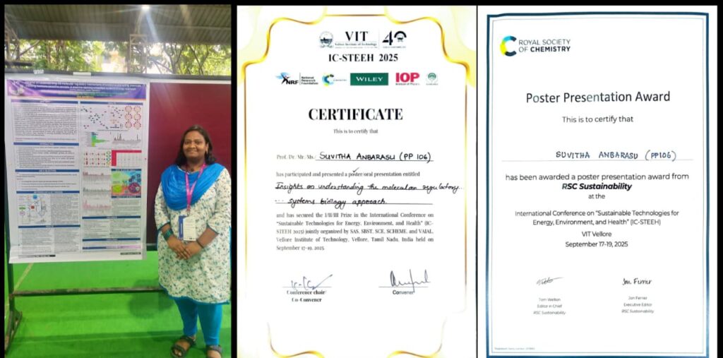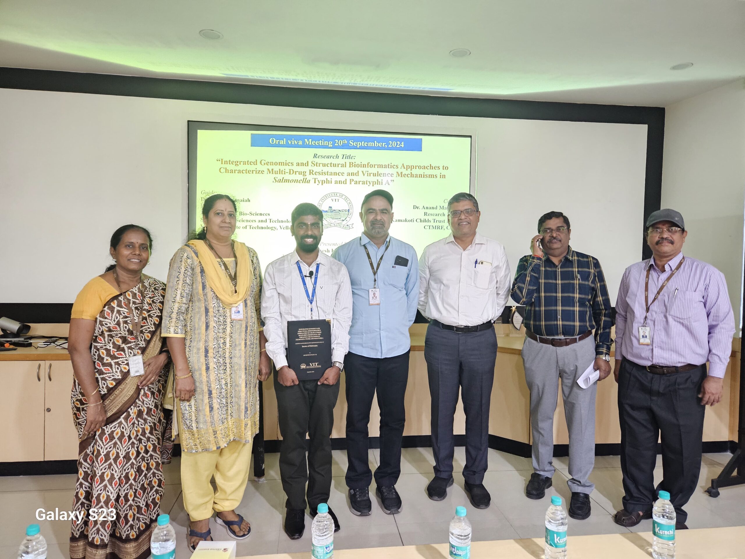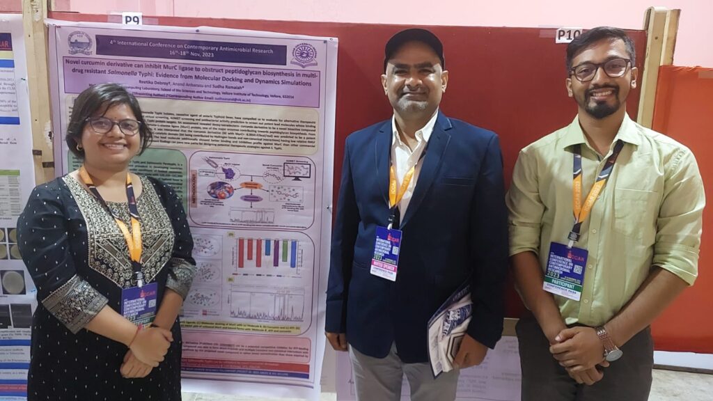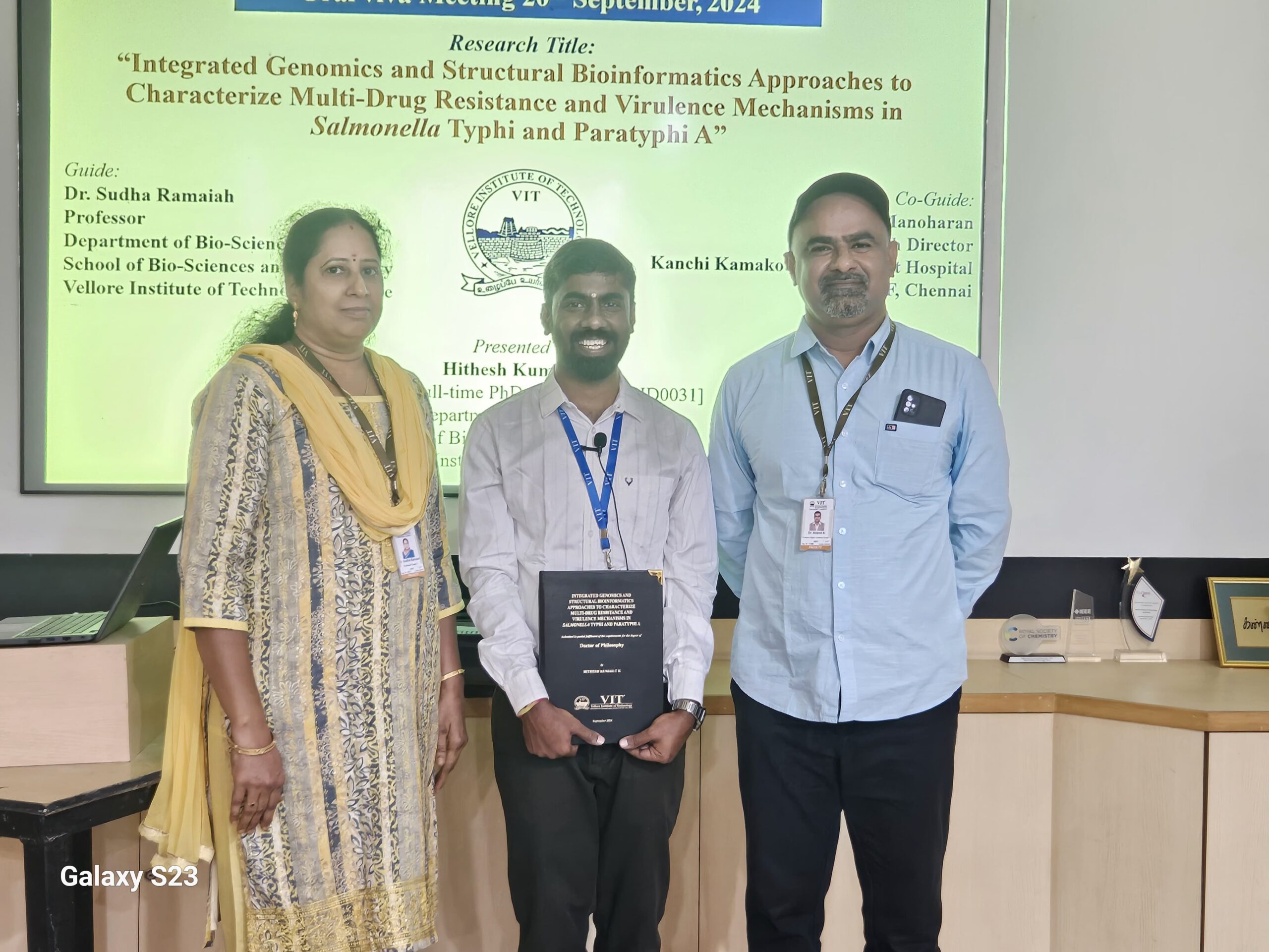 Prof. Anand Anbarasu was awarded the ICMR-NIRT Award by the ICMR–National Institute for Research in Tuberculosis, Chennai, Tamil Nadu, on 24th September 2025, in recognition of his dedication, commitment, and collaborative efforts in strengthening TB research and advancing the mission of tuberculosis eliminationProf. Anand Anbarasu invited as a speaker in the “IC-STEEH-2025″ organised by Vellore Institute of Technology, VelloreMs. Suvitha Anbarasu was awarded with best Poster presentation award at the “IC-STEEH-2025″. organised by Vellore Institute of Technology, VelloreMs. Romita Guchhait received first prize in Oral presentation at the “IC-STEEH-2025″ organised by Vellore Institute of Technology, VellorePriyamvada honored with a Doctorate By the chancellor of VITHithesh Kumar C K honored with a Doctorate By the chancellor of VITMs. Suvitha Anbarasu secured the second prize for her oral presentation at the International Conference on Personalized Medicine and Nutrition – An Insight (IPMN-25), organized by the Bioresearch Innovation Cell (BRIC) at Anna University Regional Campus, Coimbatore.Mr. Soumyadip Ghosh, had the honor of representing VIT-Vellore in the “Antimicrobial Resistance in Bacterial Pathogens-Asia” training program, organized by Wellcome Connecting Science in partnership with Mahidol University’s Faculty of Tropical Medicine, took place in Bangkok, Thailand from February 2-7, 2025Mr. Soumyadip Ghosh received certificates of participation at Antimicrobial Resistance in Bacterial Pathogens-Asia” training program” in Bangkok, ThailandCertificate received by Mr. Soumyadip GhoshProf. Anand Anbarasu has been awarded for the contributions in research publications and funded project for the year 2023 Prof. Sudha Ramaiah has been awarded for the contributions in research publications and funded project for the year 2023Priyamvada successfully defended her Ph.D oral vivaViva committee members awarded the Ph.D for PriyamvadaMBC Lab Team @ SRM university, ChennaiProf. Anand Anbarasu invited as a speaker in the “Conference on structure biology and drug discovery held at SRM university, Chennai-2024”.Ms. Suvitha Anbarasu received best Oral presentation award in the “Conference on structure biology and drug discovery held at SRM university, Chennai-2024”Mr. Rhitam Biswas received best Oral presentation award in the “Conference on structure biology and drug discoveryheld at SRM university, Chennai-2024”.Dr. Hithesh Kumar received certificates of participation at CERI Stellenbosch University, South AfricaCertificate received by Dr. Hithesh KumarHithesh Kumar successfully defended his Ph.D oral vivaViva committee members awarded the Ph.D for Hithesh KumarMBC GroupAniket Naha honored with a Doctorate By the chancellor of VITGayathri Ashok honored with a Doctorate By the chancellor of VITGayathri Ashok successfully defended her Ph.D oral vivaMBC Lab Team @ Pushpagiri Medical CollegeProf. Anand Anbarasu served as the “Organizing Chairperson ” in the 12th International Conference Bioradiance-2024 Pushpagiri Research CentreDr. Tushar Joshi received first prize in Oral presentation in Faculty/Scientist category at the “12th International Conference Bioradiance – 2024”Dr. Shalini Mathpal received second prize in Oral presentation in Faculty/Scientist category at the “12th International Conference Bioradiance – 2024”Mr. Rhitam Biswas received second prize in Oral presentation in Research Scholar category at the “12th International Conference Bioradiance – 2024”Mr. Soumyadip Ghosh received second prize in Poster presentation in Research Scholar category at the “12th International Conference Bioradiance – 2024” MbcLab Team @ Assam University, SilcharManoov successfully defended his Ph.D oral vivaAniket Naha successfully defended his Ph.D. oral vivaReetika Debroy successfully defended her Ph.D. oral vivaSoumya Basu successfully defended his Ph.D. oral vivaMr. Soumya Basu receiving first prize in ICSBCADD 2022Honorable VP Dr. Sekar Viswanathan patronizing MBCLab for the perfomance in ICSBCADD 2022MBCLab Team with Dr. Sekar Viswanathan in Alagappa UniverstiyMBCLab Team @ ICSBCADD 2022Ms. Preethi receiving young researcher award in ICIBAG 2022Doctorate conferred to our scholar Mr. Sravan Kumar Miryala